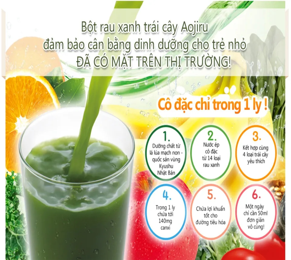 - Chiết xuất hoàn toàn từ các loại rau củ quả tươi thiên nhiên giàu chất xơ và dinh dưỡng trồng tại Nhật như: lúa mạch, rau bina, mướp đắng, xà lách, cà chua, ớt chuông, bắp, cần tây...