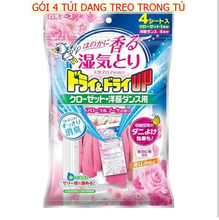 2. DẠNG TÚI TREO - TREO TRÊN SÀO QUẦN ÁO (Phù hợp tủ quần áo thiết kế thanh treo): quy cách gồm 4 túi có móc treo, mỗi túi gồm 2 ngăn hút ẩm (1 túi khoảng cho 500L~600L). Mã vạch sản phẩm: 4902407393890.