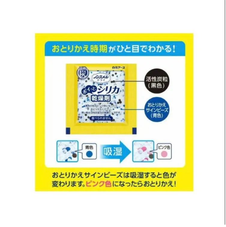 -Thiết kế thông minh có hạt chỉ thị đổi màu: Khi hạt hút ẩm chuyển từ XANH sang HỒNG, nghĩa là gói đã no ẩm – cần thay mới.