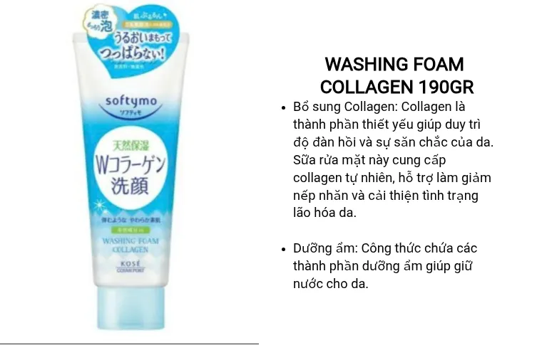 1. Kose Softymo Collagen (tuýp màu xanh đậm). Mã vạch sản phẩm: 4971710303759.