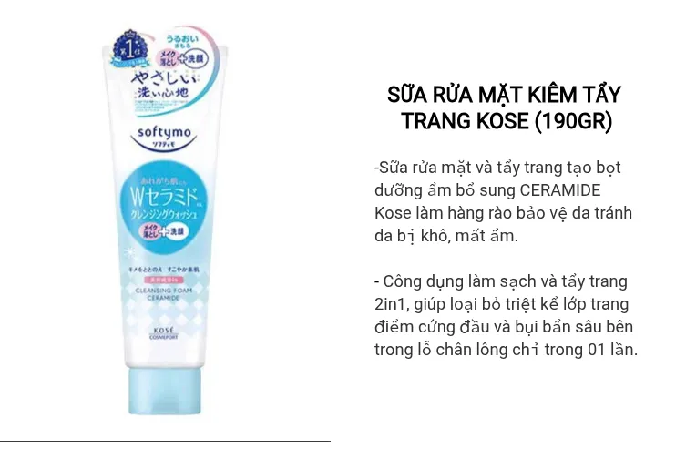 - Sữa rửa mặt Kose Softymo nhẹ nhàng đánh bật và loại bỏ các vết bẩn bằng các hạt li ti thấm sâu vào da mang đi các chất dầu trên mặt. Là sữa rửa mặt thuộc bộ sản phẩm KOSE COSMEPORT được bình chọn hàng đầu của các tạp chí làm đẹp tại Nhật trong nhiều năm.