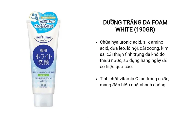 Sữa rửa mặt Kose dòng dưỡng trắng Foam White chứa các tinh chất ngọc trai và các tinh chất dưỡng da khác giúp làm trắng da, mờ các vết thâm nám, các đốm và vết thâm do mụn để lại,