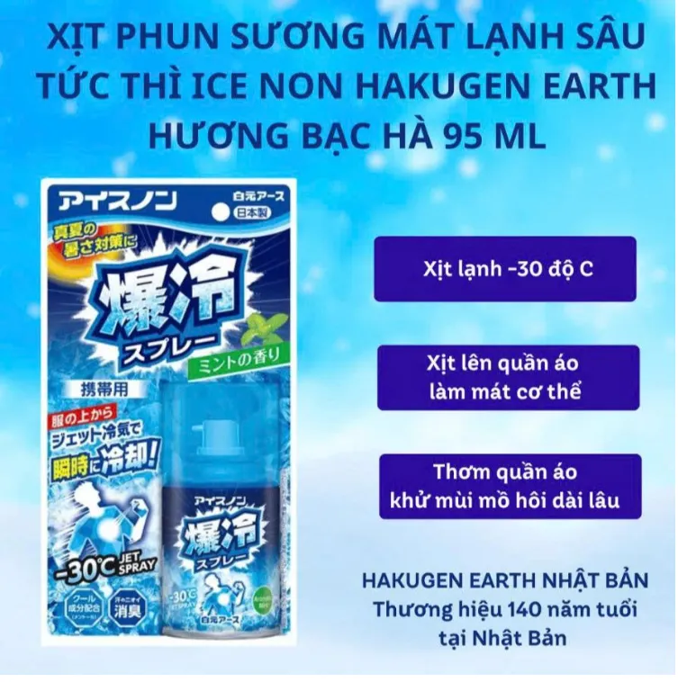 Xịt mát lạnh quần áo tức thì Hakugen là sản phẩm xịt tạo ra tia lạnh -30 độ C, giúp làm mát lạnh tức thì, bừng tỉnh cho tinh thần sảng khoái, đánh tan cơn nắng nóng khi hoạt động ngoài trời.
